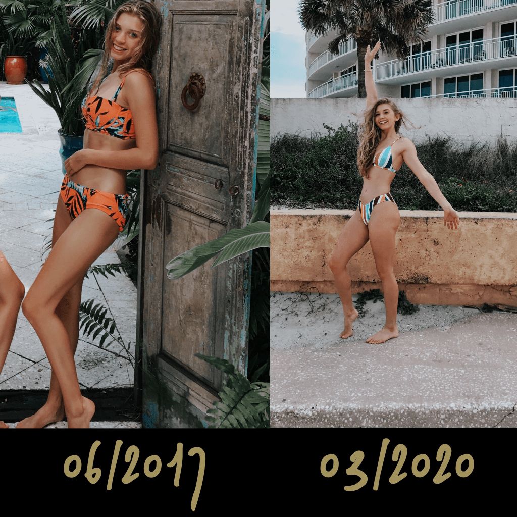 In the first picture below, taken the summer before my junior year of high school, you can see an insecure little me, covering my stomach. This girl, barely weighing 100lbs, thought she was fat. You can very clearly see my ribs and hip bones and there is no muscle to be seen. I limited myself to very low calorie foods and wanted nothing more than to shed a few pounds. Fast forward to today, my freshman year of college, I am more confident in my body than ever before. Weighing at about 120lbs, I’ve gained weight in every area I was insecure about before, but I’ve also gained muscle in the process. I still don’t have a perfectly round butt or a perfectly flat stomach, but I’m proud of the progress I have made. I, dare I say, love my body!
